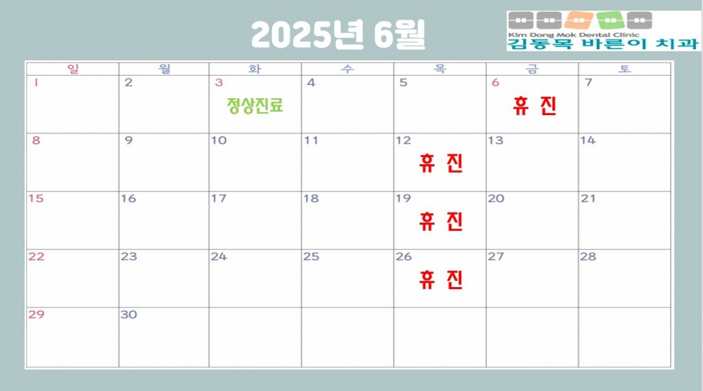 2025년 6월 진료안내입니다. 페이지 정보 작성자 김동목바른이치과 작성일25-05-19 10:08 조회609회 댓글0건 관련링크 이전글 다음글 목록 본문 2025년 6월 진료안내입니다. 댓글목록 등록된 댓글이 없습니다. 이전글 다음글 목록