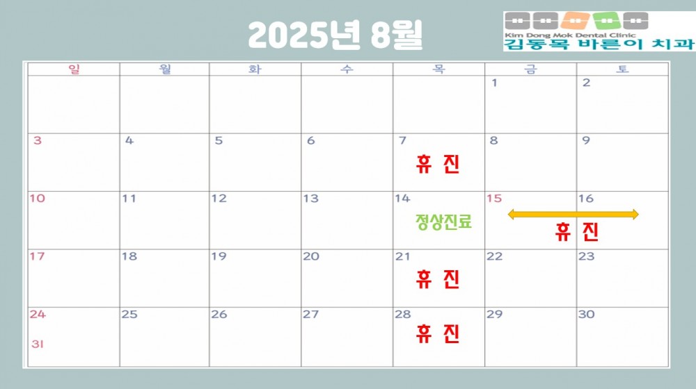김동목바른이치과 2025년 8월 진료안내입니다 페이지 정보 작성자 김동목바른이치과 작성일25-07-21 10:14 조회451회 댓글0건 관련링크 이전글 다음글 목록 본문 김동목바른이치과 2025년 8월 진료안내입니다 댓글목록 등록된 댓글이 없습니다. 이전글 다음글 목록
