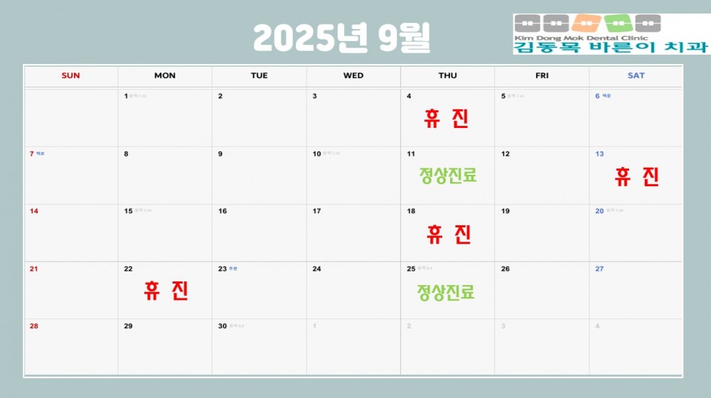 2025년 9월 진료안내입니다. 페이지 정보 작성자 김동목바른이치과 작성일25-08-19 10:59 조회440회 댓글0건 관련링크 이전글 다음글 목록 본문 김동목바른이치과 2025년 9월 진료안내입니다. 댓글목록 등록된 댓글이 없습니다. 이전글 다음글 목록